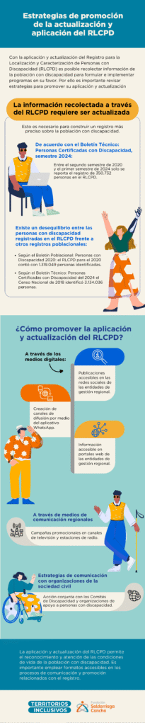 El Registro para la Localización y Caracterización de las Personas con Discapacidad (RLCPD) es un instrumento de identificación de datos poblacionales referentes a la población con discapacidad, administrado por el Ministerio de Salud y las entidades pertenecientes a este. Este sistema de registro y almacenamiento de información ofrece beneficios tanto para las personas con discapacidad como para las entidades de gestión regional. Esta lección ofrece datos sobre el nivel de desactualización del registro, así como estrategias de promoción para la aplicación y actualización de este sistema en tu región.